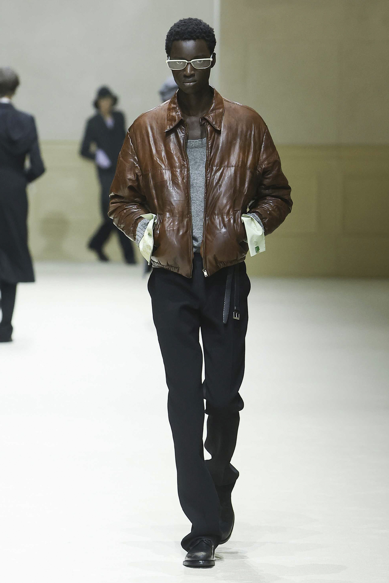 With grunge music blaring, models wore coats cut slim and long, with ultra-long shirt sleeves dangling at the cuff. From the front, the silhouettes were tight and clean, but, as models walked by, they had bucket hats pressed flat and wrinkled against their back, as if they had spent a few days lying down on them. Knits looked sumptuous, but upon closer inspection featured low-slung necklines with slightly distressed hems. A white tank wasn’t actually white, mimicking instead the yellowish, off-white colour of a sweat-stained poplin. The palette was predominantly somber, rich in drab greys and dark blues. Fabrics were rugged and rough — birdseye knits and flecked flannels — and those that weren’t bore the patina of regular wear with creases and simuli-stains, with some lightweight jackets creased as if they had only just been unpacked from a suitcase after months of travelling folded tightly into squares. Wallets were messily stuffed into back pockets, creating unsightly bulges. A series of jackets were rendered in muted shades, with peeling bits revealing a richly coloured houndstooth beneath. What was the backstory here? Had it been covered to fit in? A relic from a time where standing out was a point of pride, but now, it’s increasingly hidden.